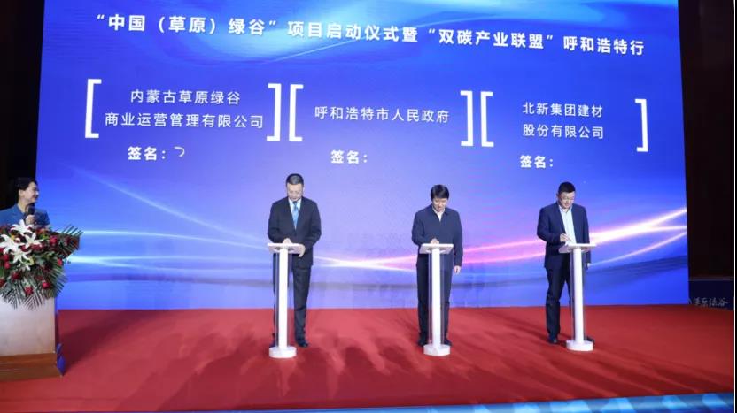 盤古智庫秘書長、中美綠色基金CEO王俊灃,呼和浩特市副市長張永文、北新建材董事長王兵進(jìn)行三方簽約